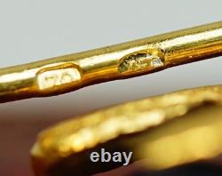 It is marked on the pin, though the marks are unfortunately hard to read. The pin was recently inspected by a professional jeweler to confirm the gold purity and the authenticity of the stones, and it has been verified as 18k yellow gold and all antural stones. The pin comes with its original presentation box, where it was found.It originates from an estate sale in Paris. The eagle only: 17mm x 16mm. Total weight: 6.15 grams. Terms & Conditions of Sale.