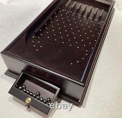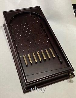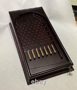 The pinball game combines the nostalgic allure of vintage aesthetics with the timeless fun of a classic game type. Whether it's a competitive challenge or a casual throwback, this piece promises to be the centerpiece of your family's next gathering. Approximately 13.5" long, 7.34" Wide, and about 3' tall at the tallest end. Drawer contains 12 steel balls. Pre Owned but in good condition.Played with so some surface marks.