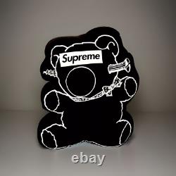 COUSSIN EN FORME D'OURS EN PELUCHE AVEC LOGO BOÎTE. Vérifiez les photos pour des mesures précises. Du haut de la tête au bas des jambes. 19 pouces / 48 centimètres. Jambes 18 pouces / 45,5 cm.Bras 15 pouces / 38 cm. Tête : 11 pouces / 28 cm. Épaisseur rembourrée de couture à couture de l'avant à l'arrière. 3 pouces / 7,8 centimètres.