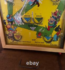 Jeu de bagatelle Vintage Poosh M Up Jnr Baseball Pinball. Un jeu de flipper de table vintage. En bon état général, couleurs vives, un peu de poussière à l'intérieur. Poosh M Up Jnr 4 En 1.