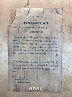 RARE Jeu de Bagatelle en Bois de Table de Poker Lindstrom des Années 1930?? Dans l'ensemble, en très bon état pour son âge et très robuste. Voir les photos car la barre en métal est un peu décalée parce qu'il manque quelques clous. Les dimensions sont disponibles pour consultation dans les photos.