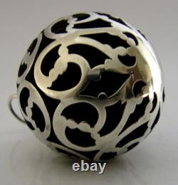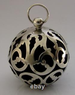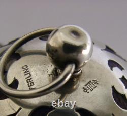 Un rare coussin à épingles en forme de boule en argent sterling massif de bonne taille. Il est estampillé avec des marques en argent STERLING américain et la marque du fabricant George A Henckel de New York, qui a exercé de 1909 jusqu'à environ 1950. Je daterais cette pièce vers 1910. Il a été magnifiquement perforé, avec l'intérieur étant une boule en bois recouverte de velours violet d'origine. Notez que la couverture est décolorée et un peu usée, mais peut être remplacée car la section de la boucle se dévisse, permettant d'accéder au tissu interne.